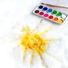 For drawing, a slightly compressed cover is most suitable, rather than fluffy, freshly fallen snow Because it will stick to the brush, and the paint will lie unevenly Lush snow can be compacted with your feet The painter should choose a tree branch, a brush, a spray bottle for spraying paints or a sponge as tools On a snow-white “sheet” you can draw a graphic image of the sun or make it colored Watercolors, acrylic paints and gouache are suitable for this They are diluted with water and then poured into a spray bottle